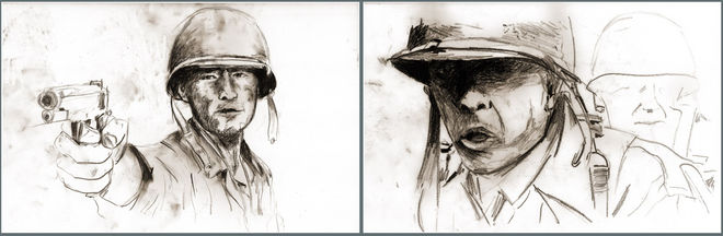 At this point, they were shooting the episodes so we only had a few shots to work with. The drawing on the right was actually made from a grab of Saving Private Ryan.